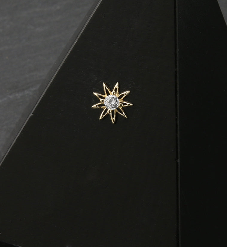 Threadless top piece with a sparkling, sunflower design on top that has a clear cz gem in the middle. Made from 14kt nickel-free gold. Length is approximately 6mm. Top measures 7mm. Sold individually (1pc, top only).