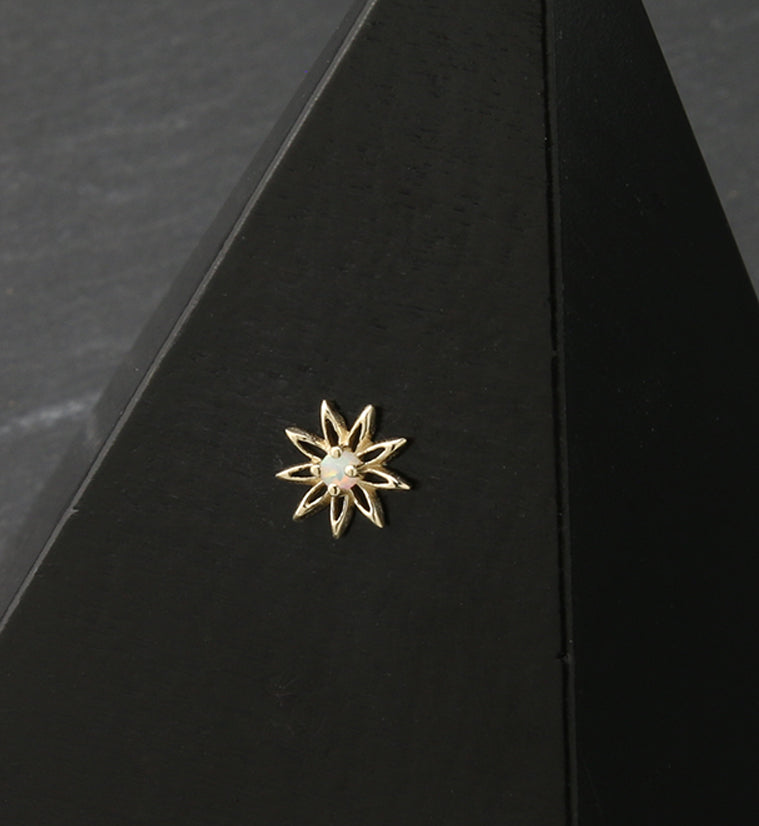 Threadless top piece with a sparkling, sunflower design on top that has a synthetic white opal gem in the middle. Made from 14kt nickel-free gold. Length is approximately 6mm. Top measures 7mm. Sold individually (1pc, top only).