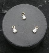Jewelry charm with a teardrop clear cz gem. Made from 14kt nickel-free yellow gold. Match this charm with different size hoops and hinged segment clickers for a unique look! Small, versatile piece for a variety of piercings. Great for a curated ear look. O-ring size: 0.8mm (thick) x 2mm (inner diameter) x 3.6mm (outer diameter). Charm size is 4mm x 6mm. Sold individually (1pc).