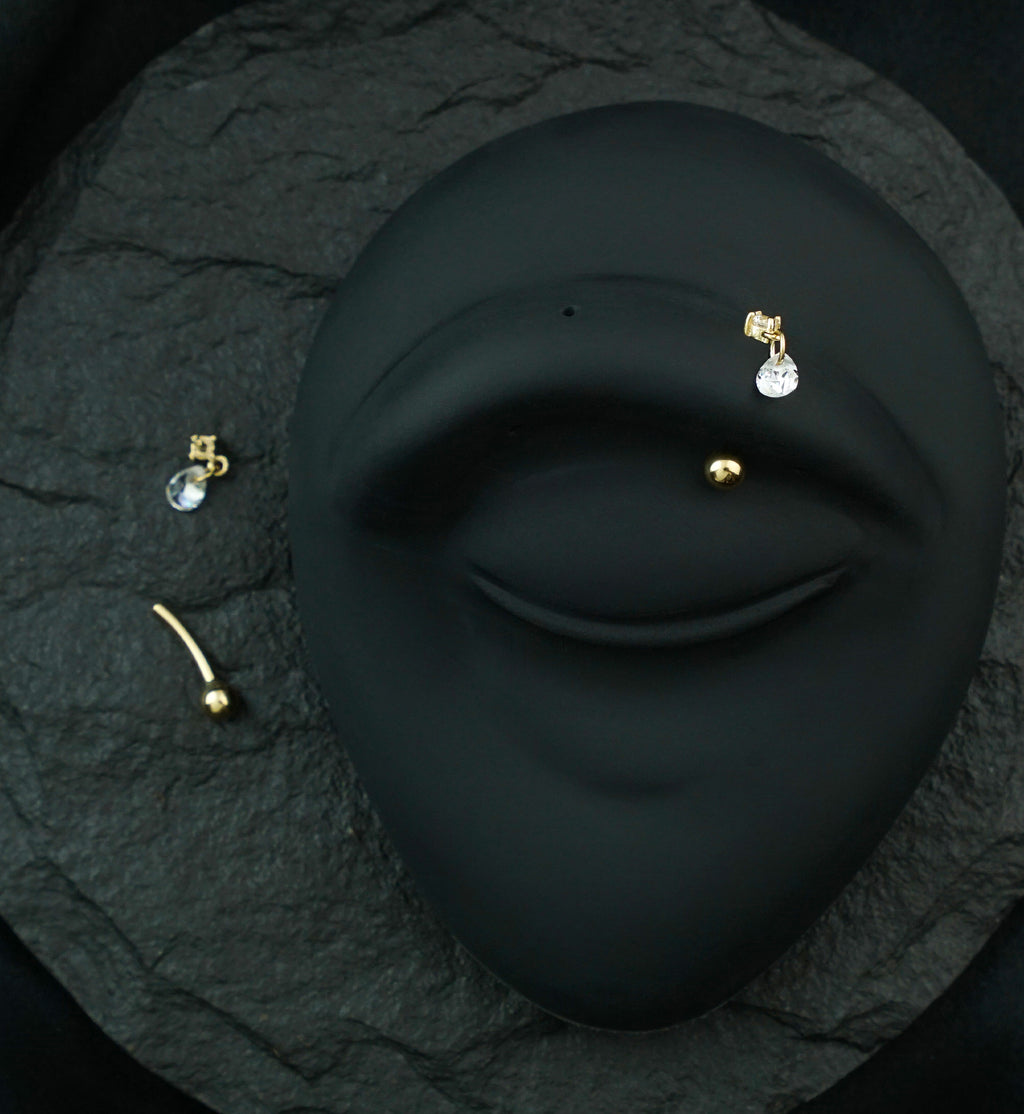 Curved barbells decorated with a dangling, teardrop cz design on top. The top piece has a threadless design that makes it effortless to put in and remove. The top design measures 9mm x 3mm. Created from 14kt gold with an inner length of 5/16" (8mm) and a 16G size. Complete with a threadless 3mm ball on the end. Sold individually. Cute jewelry piece for your eyebrow or rook piercings!