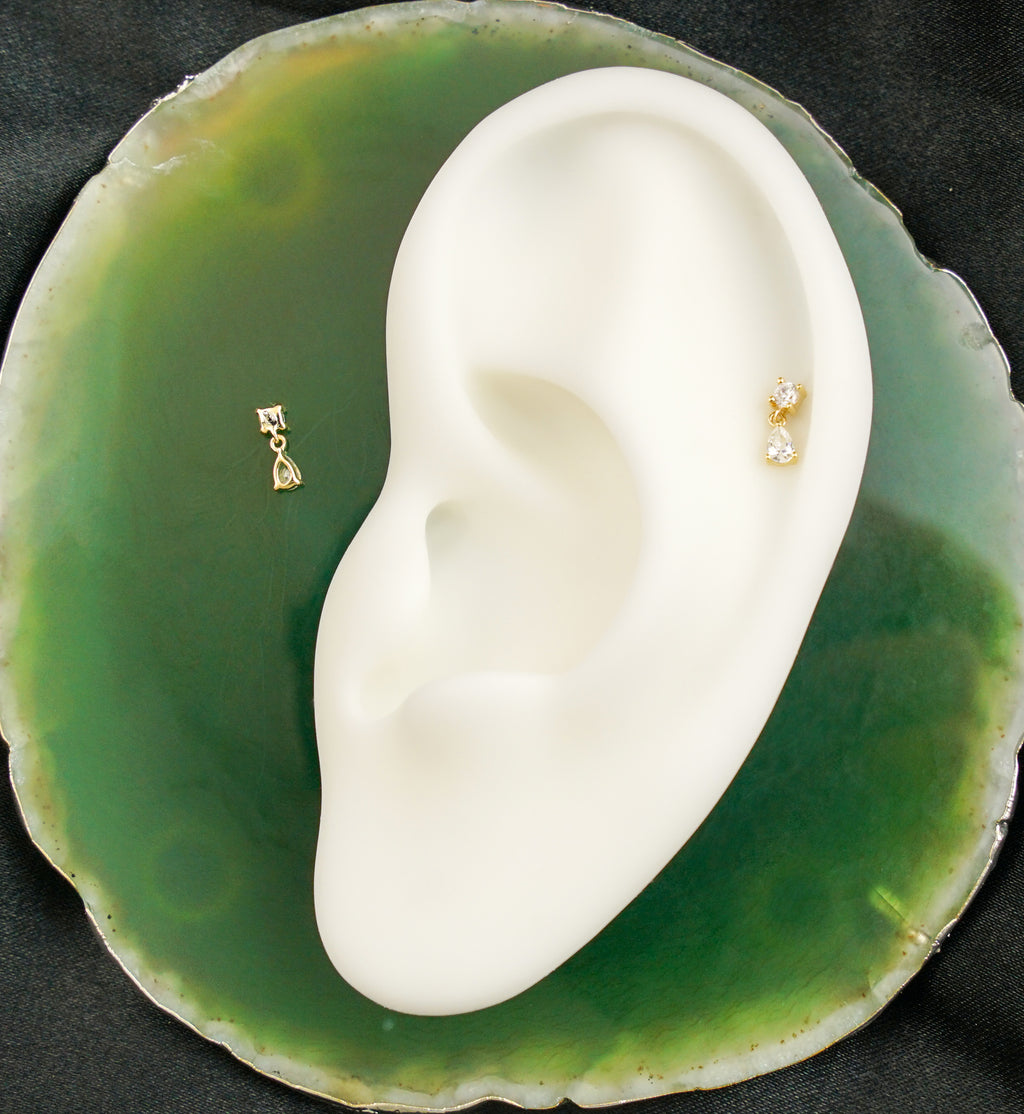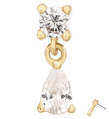 Threadless top piece that has a round, prong set, 2mm clear cz gem on top that has an attached, dangling, teardrop, clear cz gem. Made from 14kt nickel-free gold with a 316L stainless steel pin. Pin size is 25G. Length is approximately 5mm. Top size measures at 7mm x 2.4mm. Sold individually (1pc-top only).