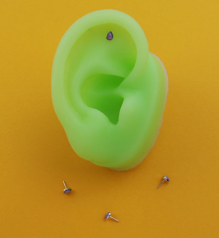 Threadless top piece that has a teardrop design that is filled with a synthetic purple opal gem. Fits all threadless posts. Made from 14kt nickel-free gold. Length is approximately 5mm. Top size: 4mm. Sold individually (1pc, top only).
