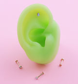 Crafted from 14kt yellow gold and featuring a stunning, synthetic white opal gem in the shape of a pear or teardrop, this threadless labret offers the perfect balance of style and comfort. Made to fit 18G or 16G piercings, its 5/16" length and 3mm disk size make it an ideal choice for those looking for a subtle but sophisticated look. The gem top measures about 3mm as well. Sold individually (2 pieces - top and bottom). For healed piercings.