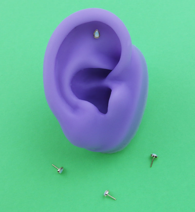 Threadless top piece that has a teardrop design that is filled with a synthetic white opal gem. Fits all threadless posts. Made from 14kt nickel-free gold. Length is approximately 5mm. Top size: 4mm. Sold individually (1pc, top only).