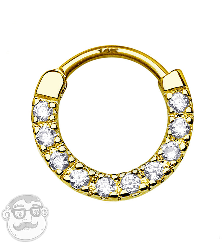 Add some sparkle to your septum or cartilage piercing with our 14kt Gold CZ Rim Septum Clicker! Made of solid 14kt yellow gold, this clicker features ten clear cubic zirconia gems set in a hinged design that opens and clicks closed. Available in size 16G with a 3/8" (10mm) inner diameter. Sold individually.