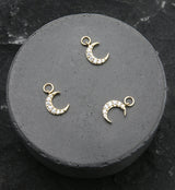 Jewelry charm shaped like a crescent moon shape that is filled with prong-set, clear cz gems and golden tips. Made from 14kt nickel-free yellow gold. Match this charm with different size hoops and hinged segment clickers for a unique look! Small, versatile piece for a variety of piercings. Great for a curated ear look. O-ring size: 0.8mm (thick) x 2mm (inner diameter) x 3.6mm (outer diameter). Charm size is 8mm x 7mm. Sold individually (1pc).