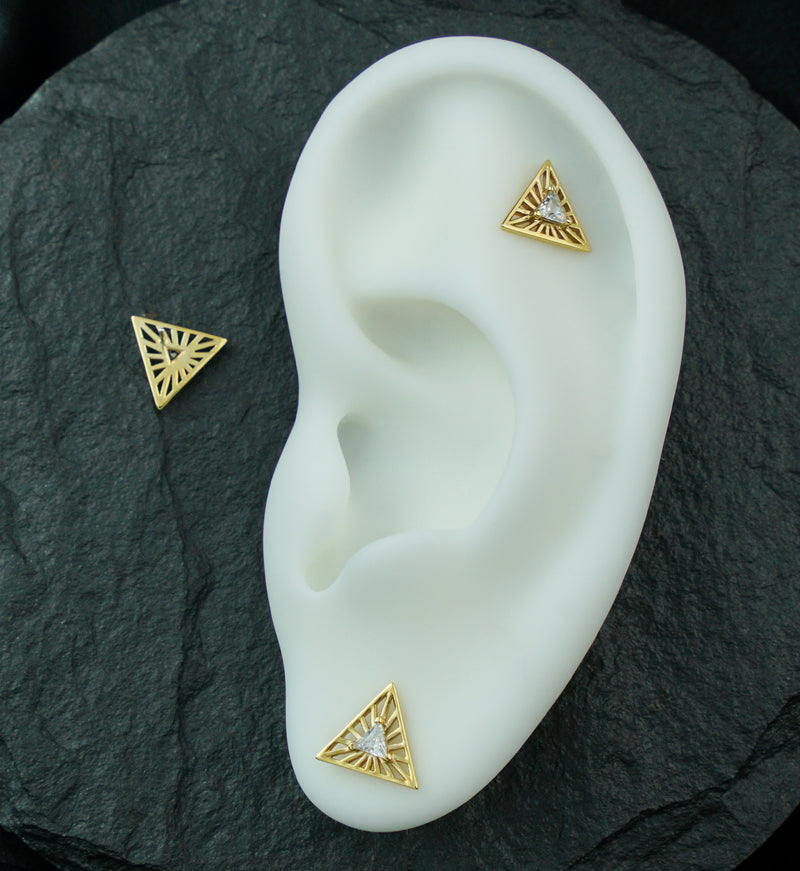 Threadless top piece that has a triangle shape with a sunburst or sunray design coming from a triangle-shaped, clear cz gem in the center. Made from 14kt nickel-free gold and a 316L stainless steel pin. Pin size is 25G. Length is approximately 5mm. Top size measures 8mm x 6.5mm. Sold individually (top only).