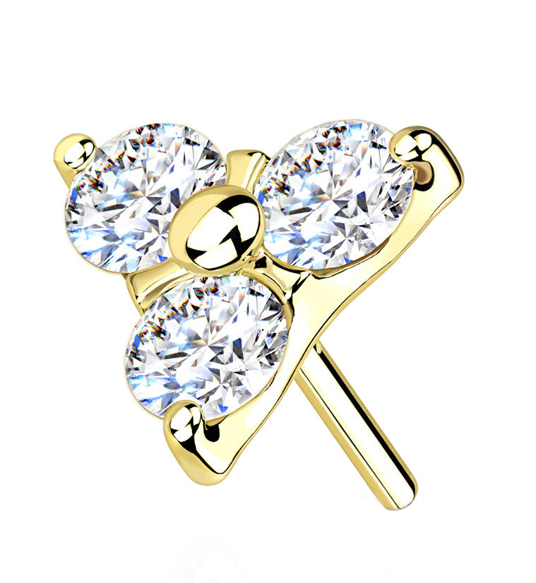 Threadless top piece with three clear cz gems. It is made from 14kt nickel-free yellow gold with a durable 316LVM ASTM F-138 stainless steel pin. Top size: 5mm. Sold individually (1 piece - top only).