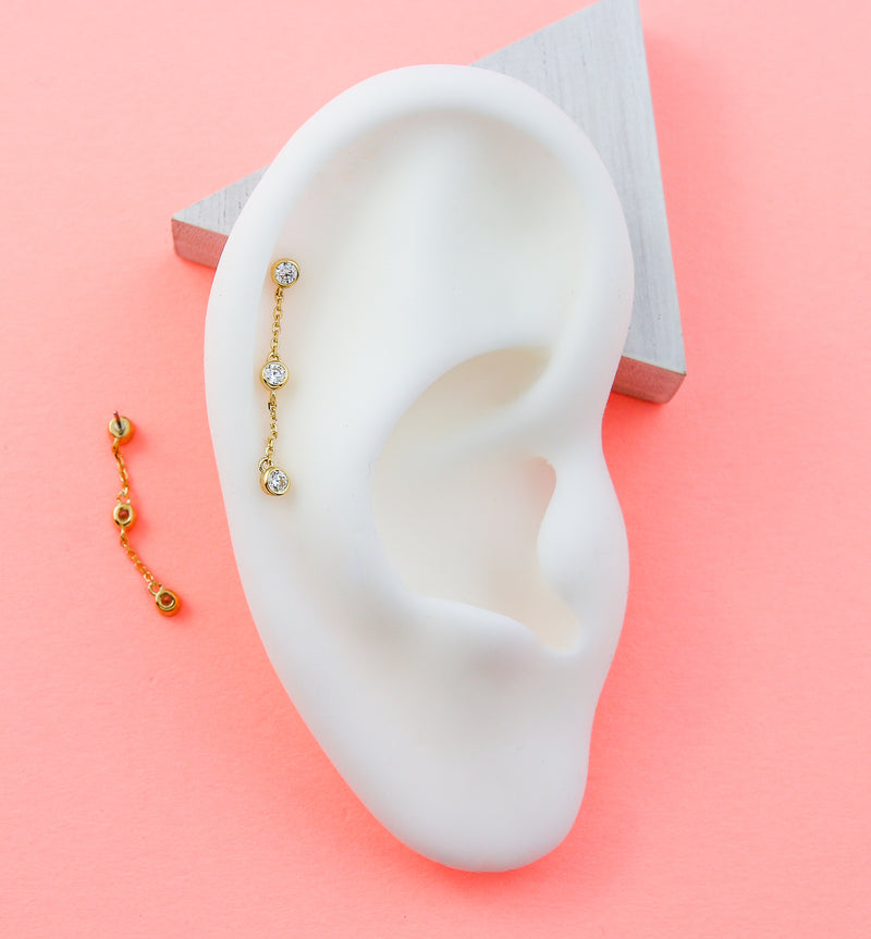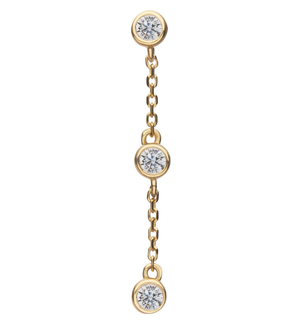 Dangling 14kt gold top piece that has a straight chain design that has three, bezel-set, clear cz gems throughout. All of the gems measure about 2.5mm each. Fits all threadless posts. Made from 14kt nickel-free gold with a 316L stainless steel pin. Top size: 22mm x 2.8mm. Chain size: 6mm. Pin size is 25G. Pin length is approximately 5mm. Sold individually (top only).