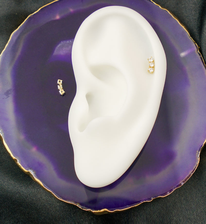 Sparkly, threadless top piece that has an arched design that is filled with three, round, clear cz gems. Fits all threadless posts. Made from 14kt nickel-free gold with a 316L stainless steel pin. Pin size is 25G. Length is approximately 5mm. Top size measures around 7.5mm x 3mm. Sold individually (1pc-top only).