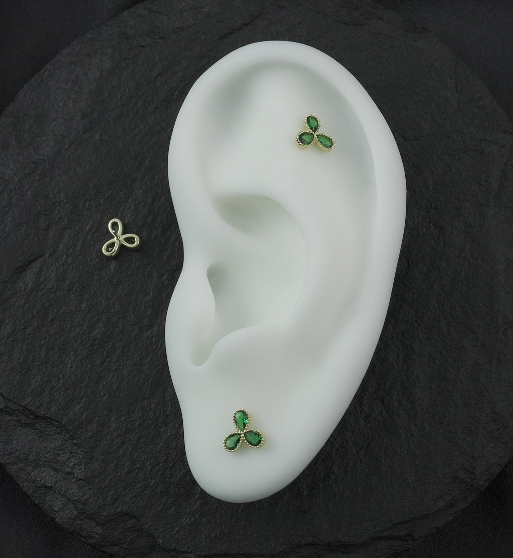 This playful and stylish top features a triple, teardrop-shaped emerald CZ gem set in 14kt nickel-free gold. The edge of each gem features a milgrain texture that adds a touch of vintage flair. Versatile piece for cartilage or tragus piercings. Sold individually.