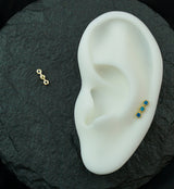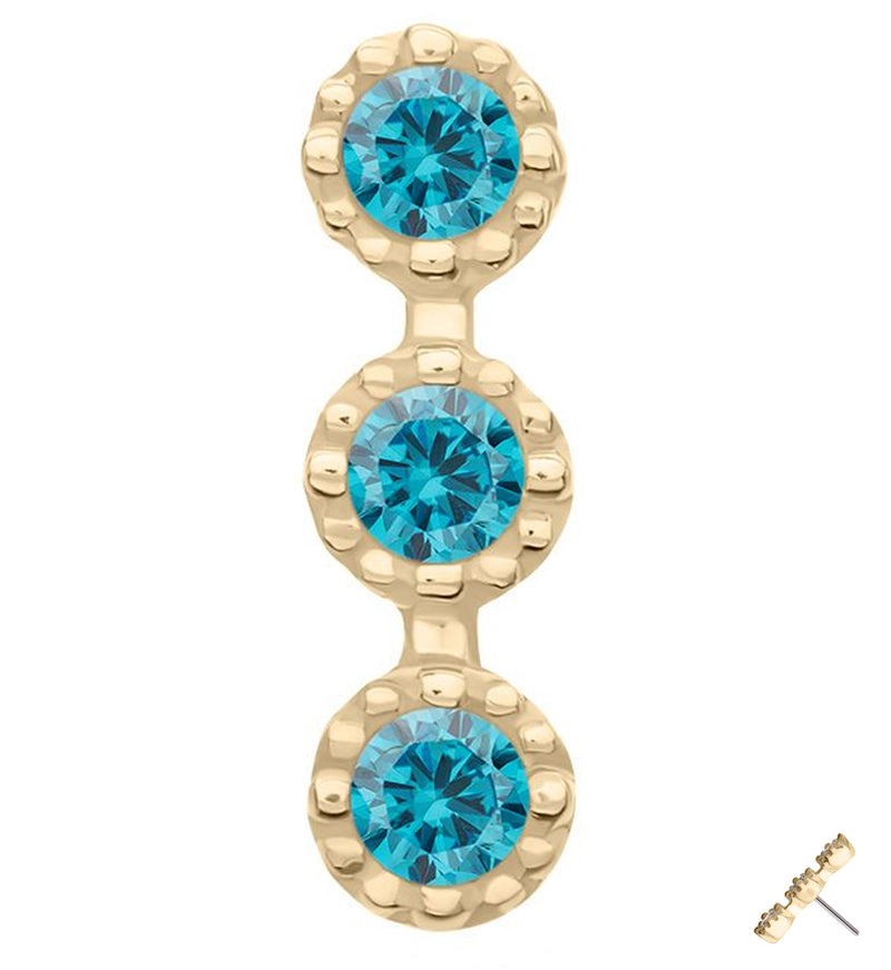 Threadless top piece that has a beaded, stacked, triple light blue topaz cz gem design. Made from 14kt nickel-free gold with a 316L stainless steel pin. Pin size is 25G.