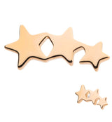 Threadless top piece in the shape of three curved stars. It is made from 14kt nickel-free yellow gold with a durable 316LVM ASTM F-138 stainless steel pin. Sized at 9.5mm x 4.8mm. Sold individually (1 piece - top only).