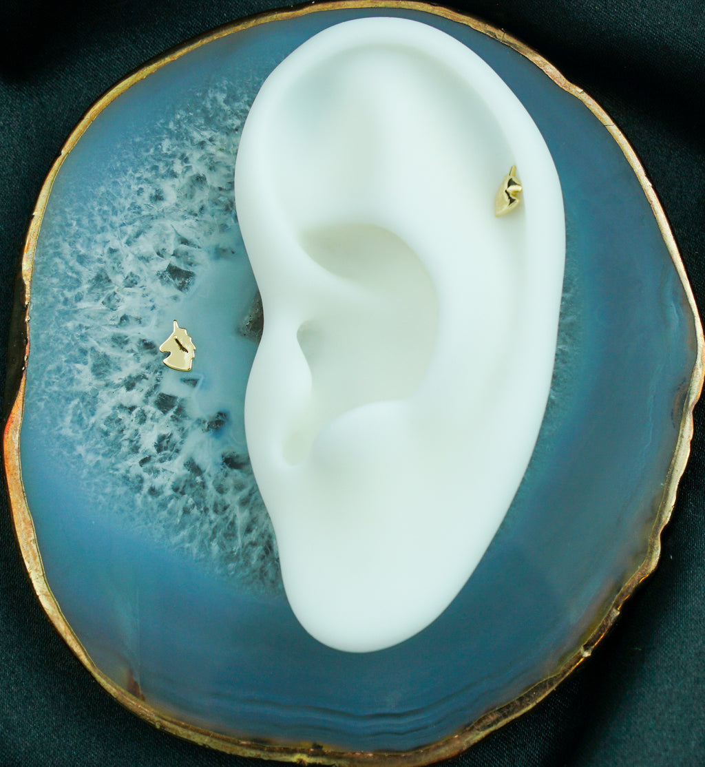 14kt nickel-free gold threadless top piece with a unicorn head shape. Pin size is 25G and fits most threadless posts. The size is about 6mm x 5mm. Magical top to add to your cartilage or tragus piercing! Sold individually (top only).