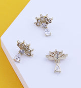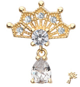 Beautiful threadless top piece that has a fan shape design that is accented with clear cz gems throughout as well as a dangling, 4mm teardrop clear cz gem. Fits all threadless posts. Made from 14kt nickel-free gold with a 316LVM ASTM F-138 implant grade steel pin. Length is approximately 5mm. Top size measures about 10.5mm x 7mm, teardrop gem: 4mm x 3mm. Sold individually (1pc, top only).