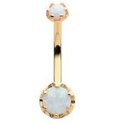 Beautiful, golden belly button ring made from 14kt nickel-free gold. It consists of a a synthetic white opal gem on top and bottom. Gem design is 3mm on top and 5mm bottom design. Size is 14G with a 7/16" 11mm barbell. Internally threaded. Sold individually (1 pc). For healed piercings.