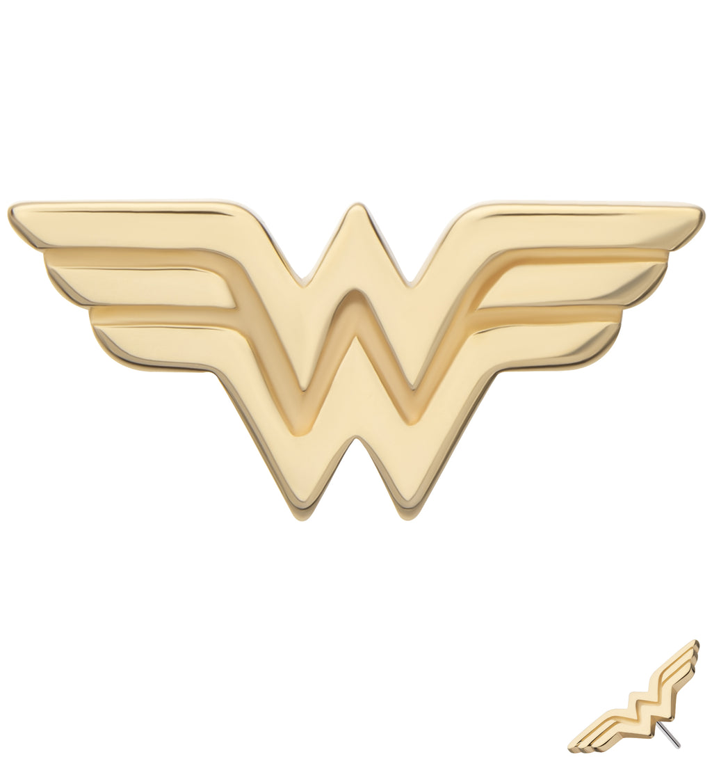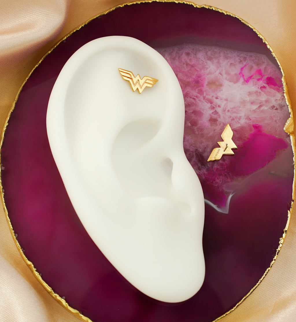 Threadless top piece that has a Wonder Woman logo design. This jewelry piece is made with 14kt nickel-free yellow gold and a 316LVM ASTM F-138 5mm stainless steel pin. Fun jewelry choice for a variety of ear piercings! Sold individually (1pc).