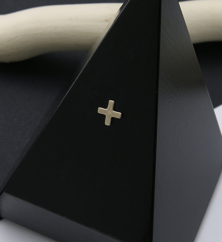 14kt nickel-free gold plus sign or letter x threadless top piece. 316LVM ASTM F-138 stainless steel pin. Sized at 5mm x 5mm. Sold individually (1 piece - top only).