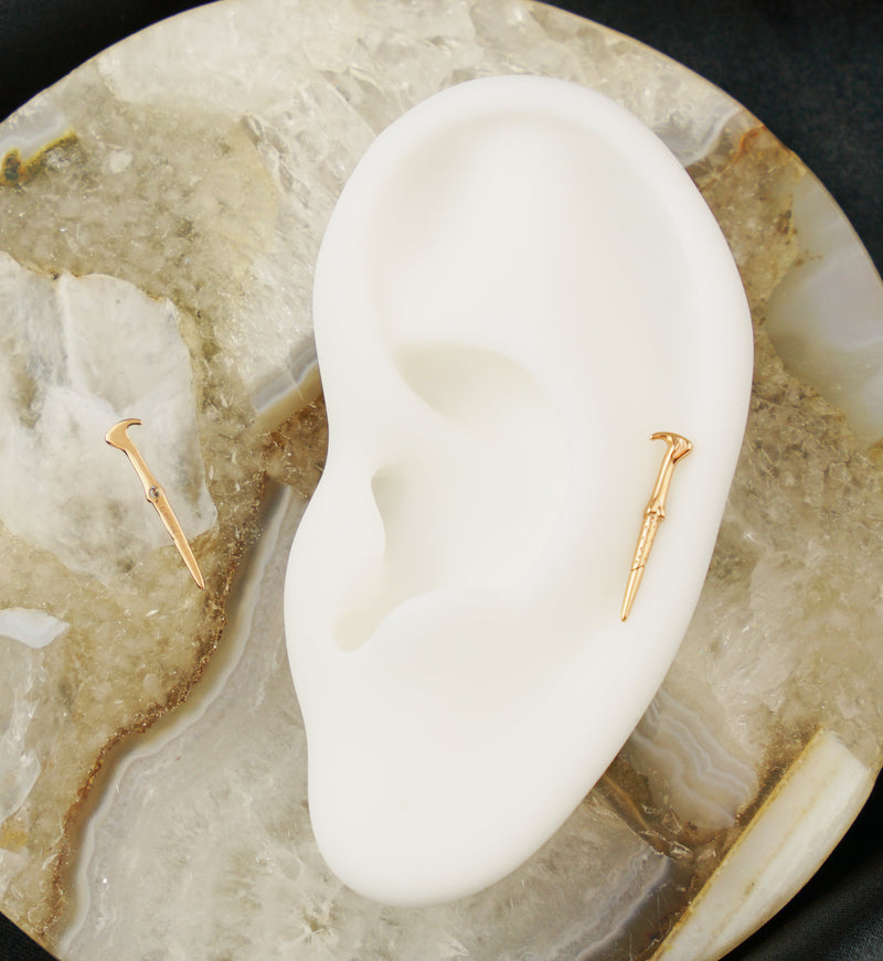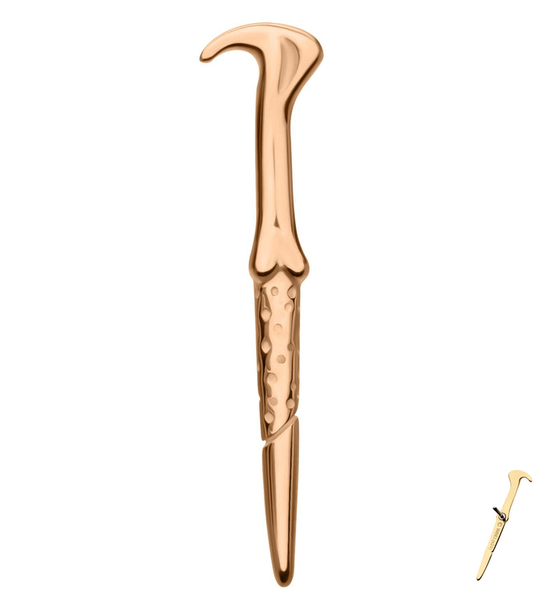 Rose gold, threadless top piece that has Voldemort's wand from Harry Potter on top. This jewelry piece is made with 14kt nickel-free rose gold and a 316LVM ASTM F-138 5mm stainless steel pin. Intriguing threadless jewelry piece for a variety of ear piercings and for Harry Potter fans! Sold individually (top only).