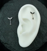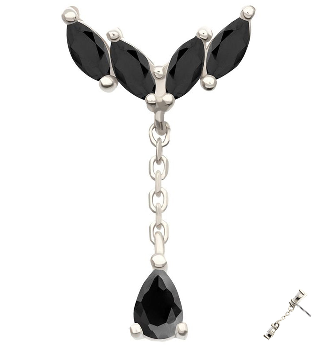 Dangling threadless top piece that has a v-shape and is accented with black cz gems. Attached is a dangling, teardrop black cz gem. Made from 14kt nickel-free white gold with a 316L stainless steel pin. Pin size is 25G. Length is approximately 5mm. Top size measures 13mm x 8mm. Sold individually (top only).