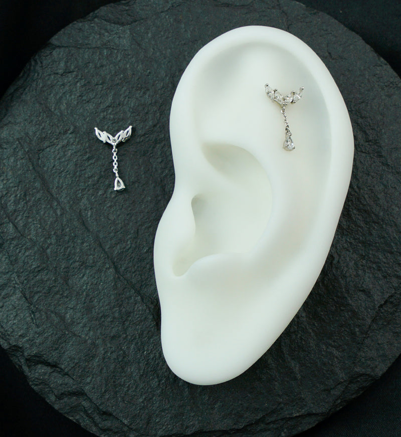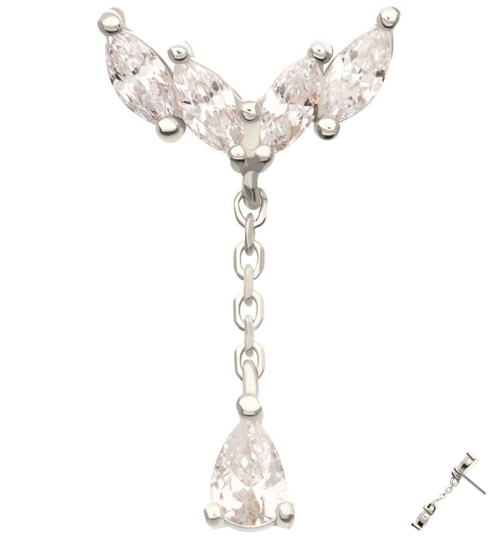 Threadless top piece that has a v-shape and is accented with clear cz gems. Attached is a dangling, teardrop clear cz gem. Made from 14kt nickel-free white gold with a 316L stainless steel pin. Pin size is 25G. Length is approximately 5mm. Top size measures 13mm x 8mm. Sold individually (top only).