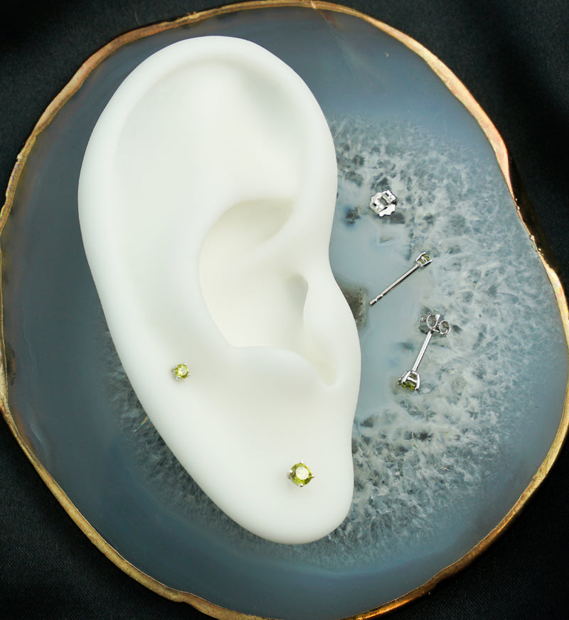 Birthstone stud earrings with a round, peridot cz gem on the top, the birthstone for August. Made from shining 14kt white gold. Size is 20G with a wearable of about 1/4" (6mm). Stud design with a butterfly back. Choose your gem size from 2mm or 3mm! Sold in pairs (2pcs). For healed piercings - these might have small traces of nickel.