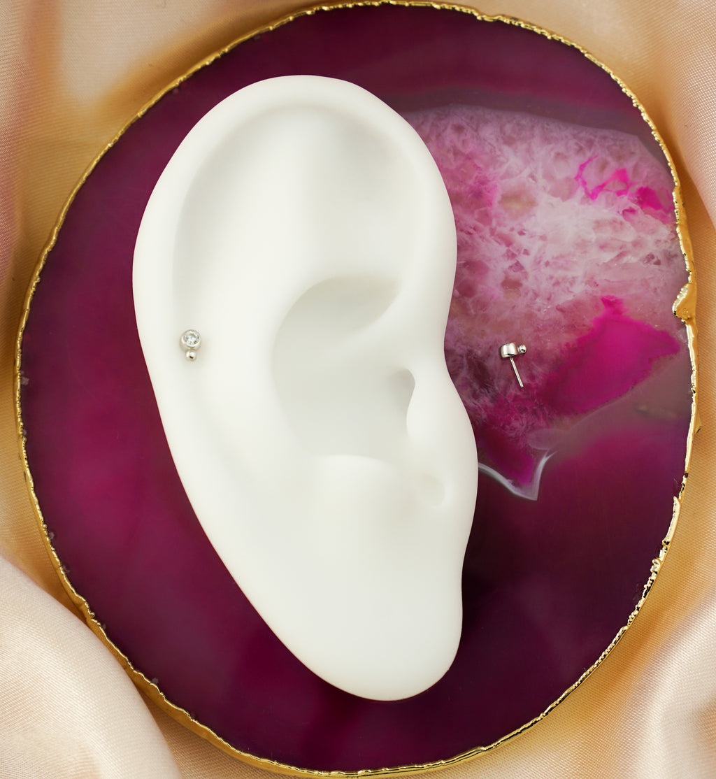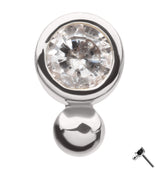Sparkly, threadless top piece that has a bezel-set, clear cz gem with an accented drop bead. Fits all threadless posts. Made from 14kt nickel-free white gold with a 316LVM ASTM F-138 implant grade steel pin. Length is approximately 5mm. Top size: 3.8mm x 1.8mm. Sold individually (top only).