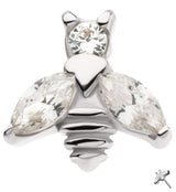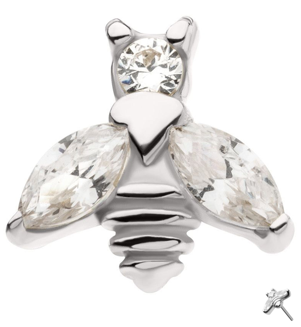 Threadless top piece that has a bee design on top that has marquise clear cz gem for wings. This jewelry piece is made with 14kt nickel-free white gold and a 316LVM ASTM F-138 5mm stainless steel pin. Cute, summery jewelry choice for a variety of ear piercings! Sold individually (1pc).