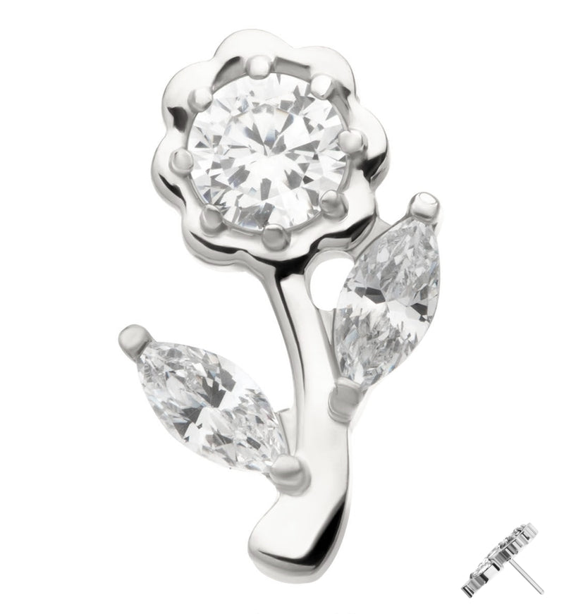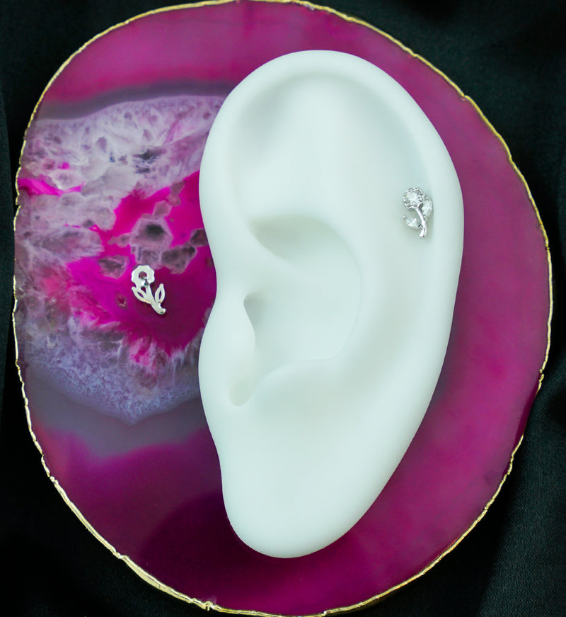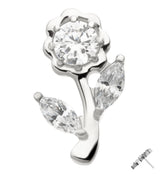 Threadless top piece that has a growing rose and stem design that is accented with a clear cz gem in the center and marquise clear cz gems as the leaves. This jewelry piece is made with 14kt nickel-free white gold and a 5mm, 316LVM ASTM F-138 stainless steel pin. Beautiful jewelry piece for a variety of your cartilage piercings! Sold individually (1pc).