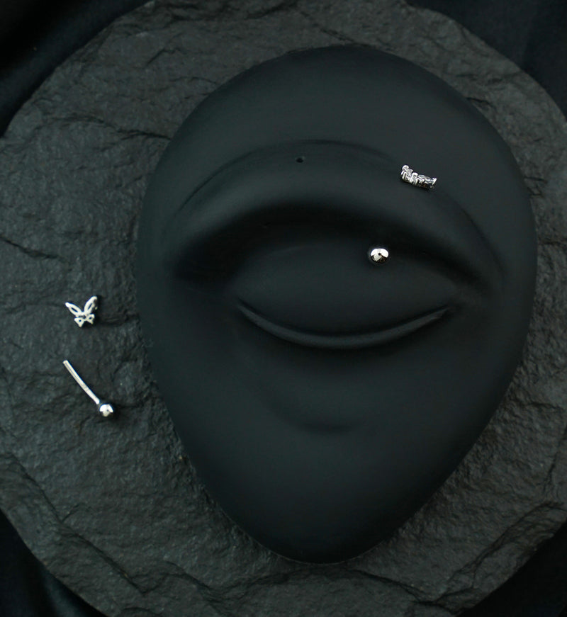 White gold curved barbells decorated with a butterfly cz design on top. The top piece has a threadless design that makes it effortless to insert and take out. The top design measures 5mm. Made from 14kt white gold with an inner length of 5/16" (8mm) and a 16G size. Complete with a 3mm ball on the end. Sold individually. Demure jewelry piece for your eyebrow or rook piercings!
