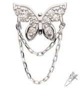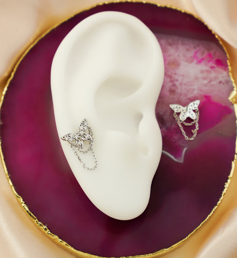 Threadless top piece that has a butterfly design on top that is filled with clear cz gems. Attached is a double, dangling chain. This jewelry piece is made with 14kt nickel-free white gold and a 316LVM ASTM F-138 5mm stainless steel pin. Lovely jewelry choice for a variety of ear piercings! Sold individually (1pc).
