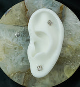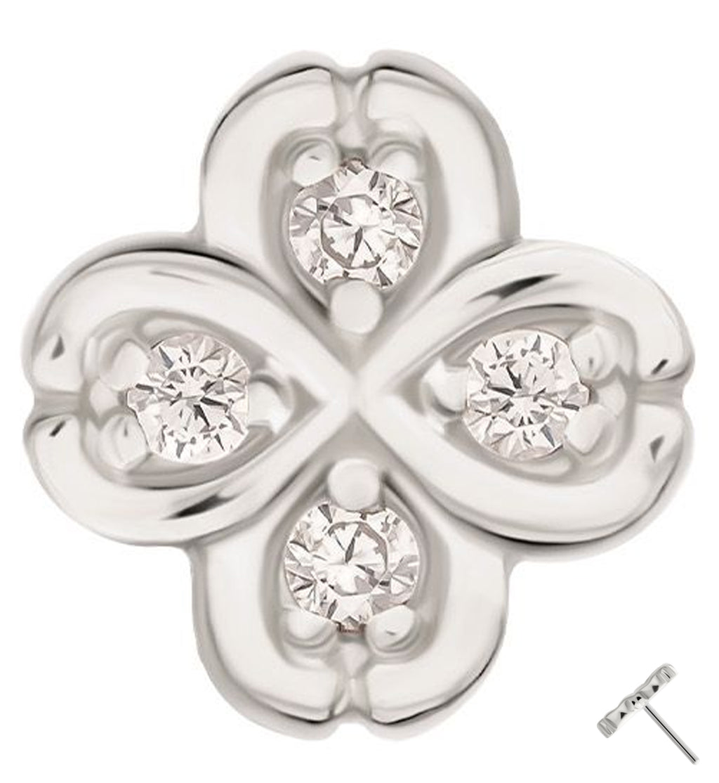 This stunning 14kt white gold top, featuring sparkling clear CZ gems, is perfect for cartilage or tragus piercings. It has a four leaf clover design that is filled with clear cz gems. Made with nickel-free white gold and a 316L stainless steel pin, it's both stylish and hypoallergenic. Sold individually, the top measures 6mm x 6mm and has a 25G pin size.