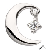 Threadless top option that has a crescent moon design with an attached, dangling 1.5mm clear cz gem. Fits most threadless posts. Created from 14kt nickel-free white gold with a 316L stainless steel pin. Length is approximately 5mm. Top size: 6.5mm x 5.5mm. Sold individually (top only).
