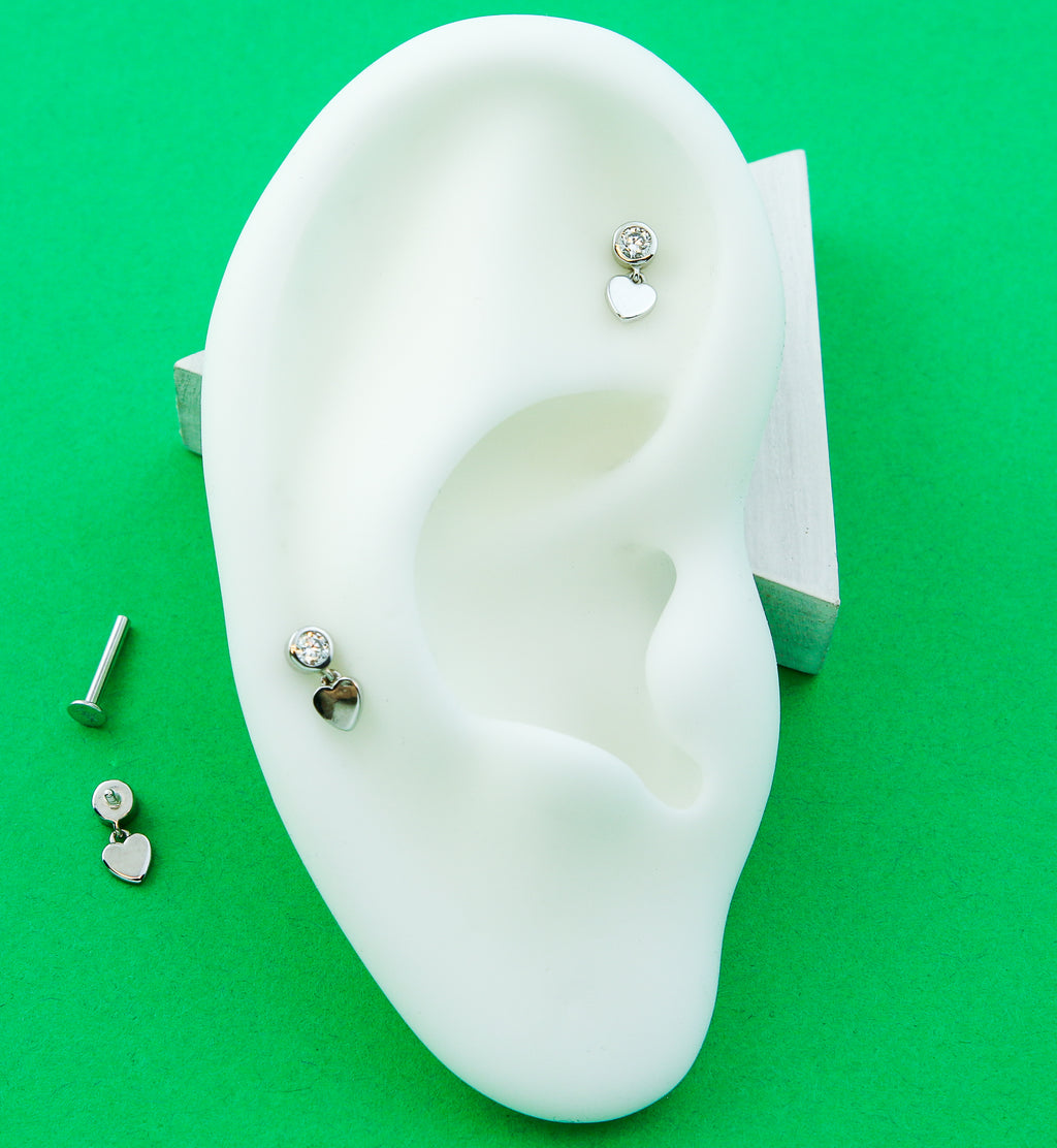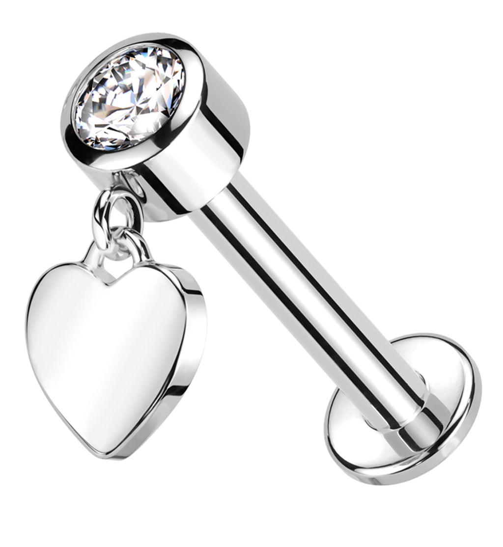 14kt White Gold Dangle Heart Clear CZ Internally Threaded Labret