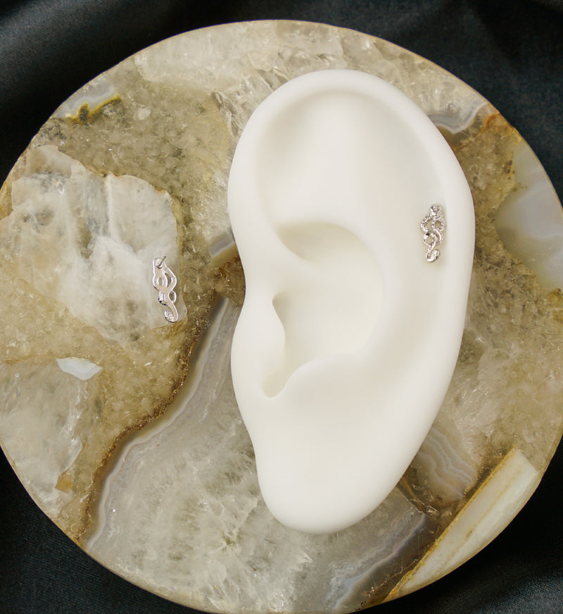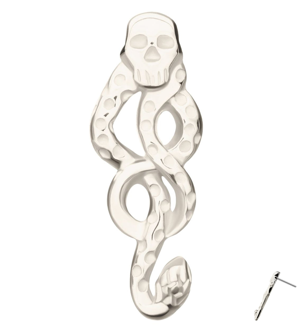 Threadless top that has the Dark Mark from Harry Potter as the design. This jewelry piece is made with 14kt nickel-free white gold and a 316LVM ASTM F-138 5mm stainless steel pin. Mysterious threadless jewelry piece for a variety of ear piercings and for Harry Potter fans! Sold individually (1pc).