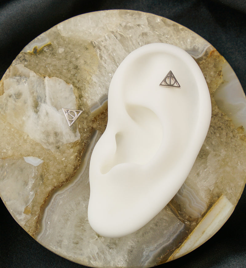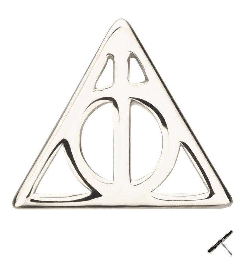 Threadless top piece that has the Deathly Hallows symbol from Harry Potter on top. This jewelry top piece is made with 14kt nickel-free white gold and a 316LVM ASTM F-138 5mm stainless steel pin. Cool threadless jewelry for a variety of ear piercings and for Harry Potter fans! Sold individually (top only).