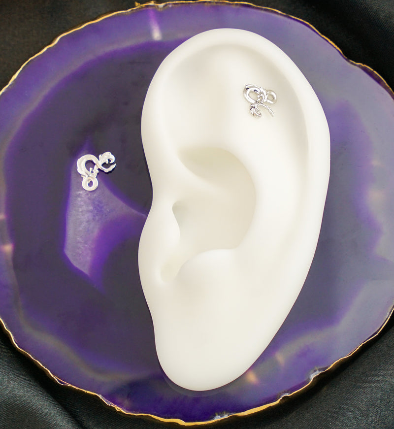 Fun threadless top piece that has the dungeons and dragons ampersand logo. Made from 14kt nickel-free white gold with a 316L stainless steel pin. Pin size is 25G. Length is approximately 5mm. Top size measures 8mm x 7.9mm. Sold individually (top only).