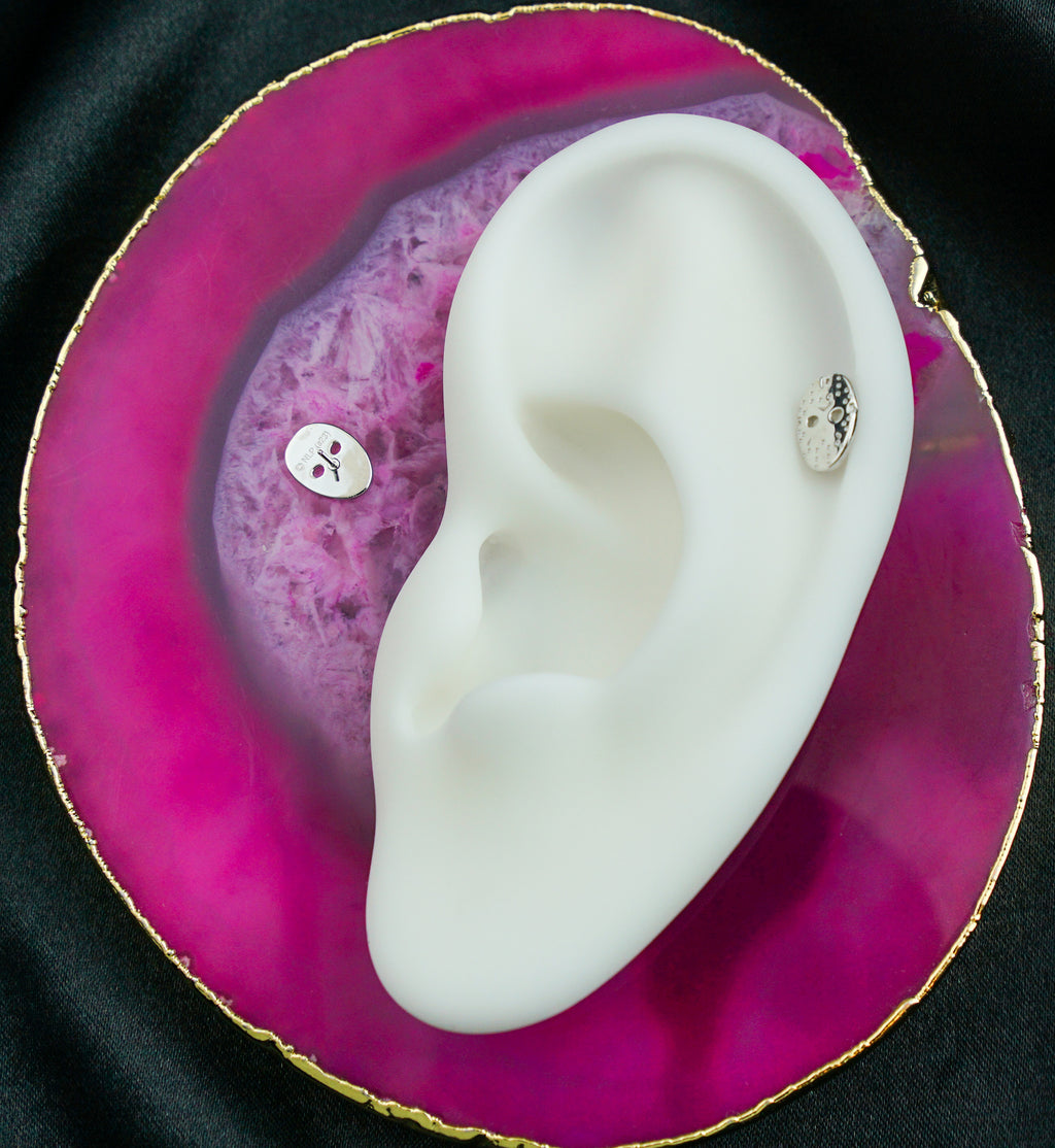 14kt nickel-free white gold threadless top piece that has the infamous mask Jason wore in the movie Friday The 13th. Pin size is 25G and fits most threadless posts. The size is about 8mm x 6mm. Spooky top choice to add to your cartilage or tragus piercing! Sold individually (top only).