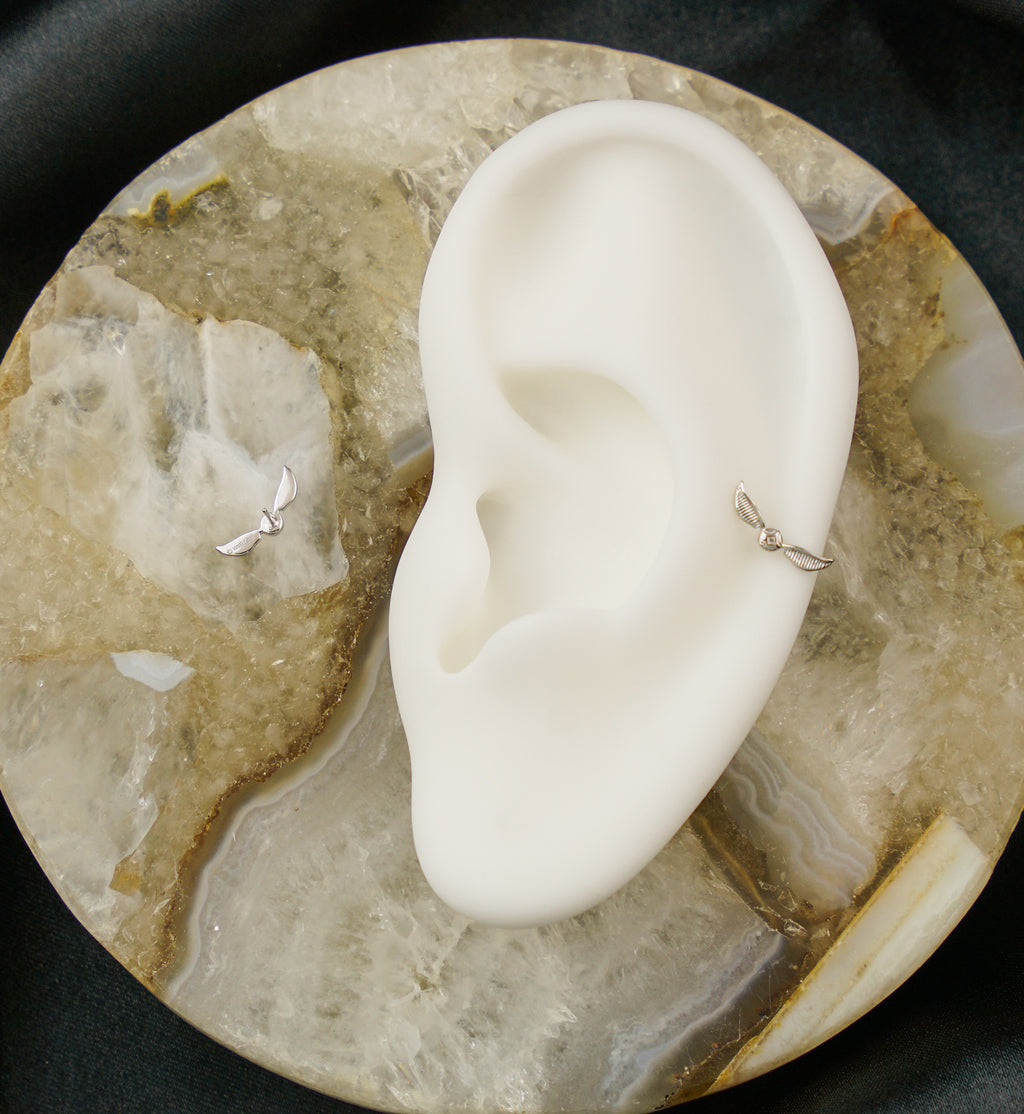 This threadless top has the Golden Snitch from Harry Potter on top. This jewelry piece is made with 14kt nickel-free white gold and a 316LVM ASTM F-138 5mm stainless steel pin. Cute threadless jewelry piece for a variety of ear piercings and for Harry Potter fans! Sold individually (top only).