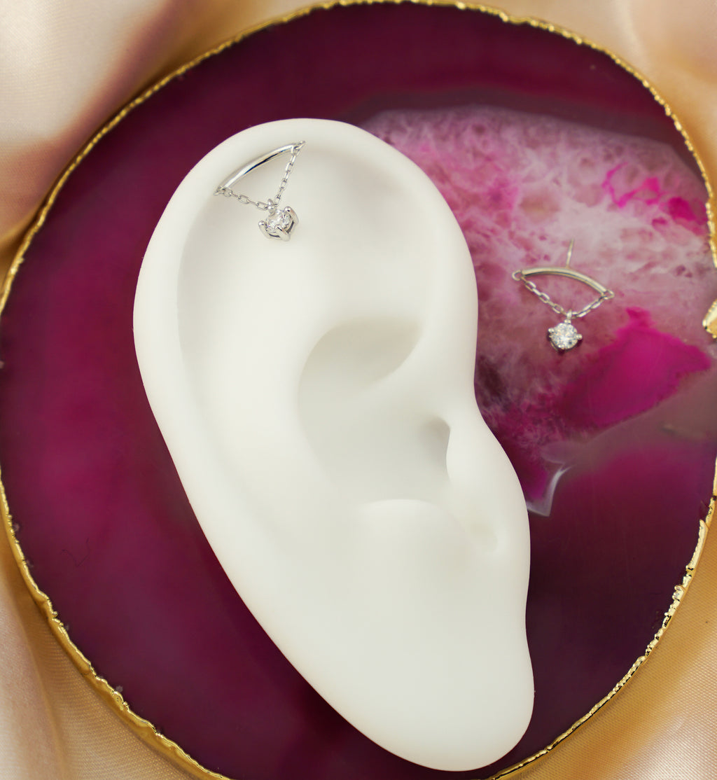 Made with nickel-free 14kt white gold and a 316L stainless steel pin, this 11.5mm x 2.2mm (dangle: 11mm) top features a secure 25G pin fit for most threadless posts. This piece has a curved bar design that can appear to be hidden depending on what piercing you use it for and it is accented with a prong-set, clear cz gem. Sold individually.