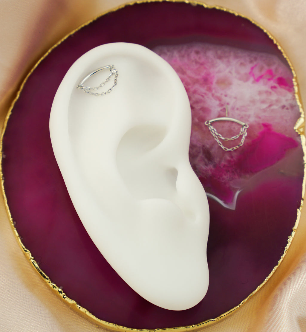 Made with nickel-free 14kt white gold and a 316L stainless steel pin, this 12mm x 2.2mm (dangles: 7mm, 10mm) top features a secure 25G pin fit for most threadless posts. This piece has a curved bar design that can appear to be hidden depending on what piercing you use it for. Sold individually.