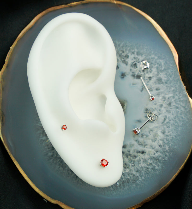 Birthstone stud earrings with a round, garnet cz gem, the pretty colored birthstone for January. Made from high-quality 14kt white gold. Size is 20G with a length of 1/4" (6mm). The stud earring design has a butterfly back. Choose your gem size : 2mm or 3mm! Sold in pairs. Meant for healed piercings - these might have small traces of nickel.