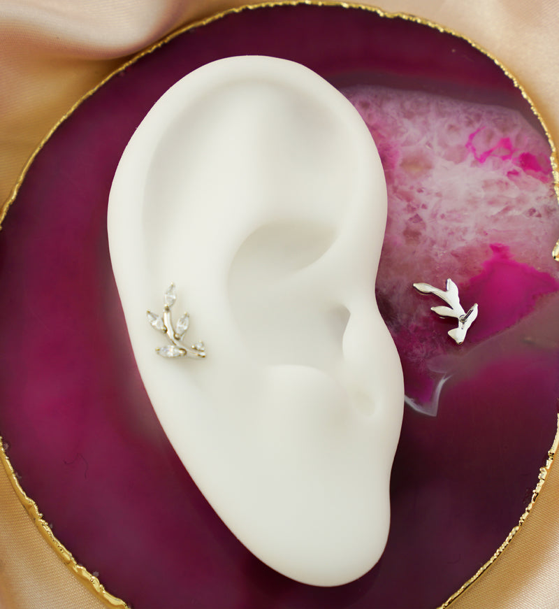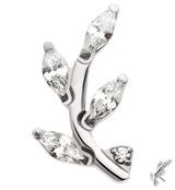 Threadless top piece that has a leaf design that is accented with marquise, clear cz gems. Fits all threadless posts. Made from 14kt nickel-free white gold with a 316L stainless steel pin. Pin size is 25G. Pin length is approximately 5mm. Size is about 10mm x 6mm. Sold individually (top only).