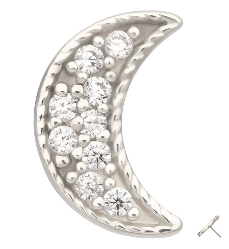 Shimmering, threadless top piece that has a delicately beaded edge along a crescent moon design. In the center are several clear, cz gems. Made from 14kt nickel-free white gold with a 316L stainless steel pin. Pin size is 25G. Length is approximately 5mm. Top size measures 7.9mm x 5.2mm. Sold individually (1pc - top only).