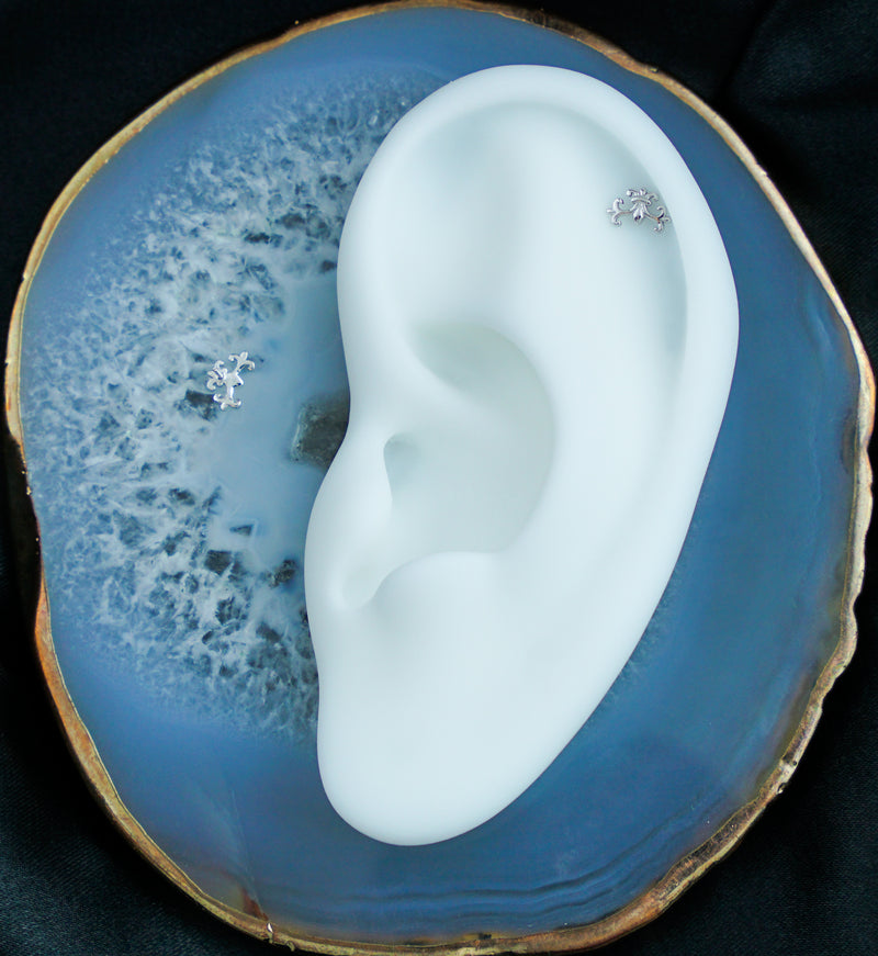14kt nickel-free white gold threadless top piece that has a fleur de lis symbol design. Pin size is 25G and it fits most threadless posts. The size is about 7mm x 4mm. Pretty piece to add to your threadless top collection! Sold individually (top only).