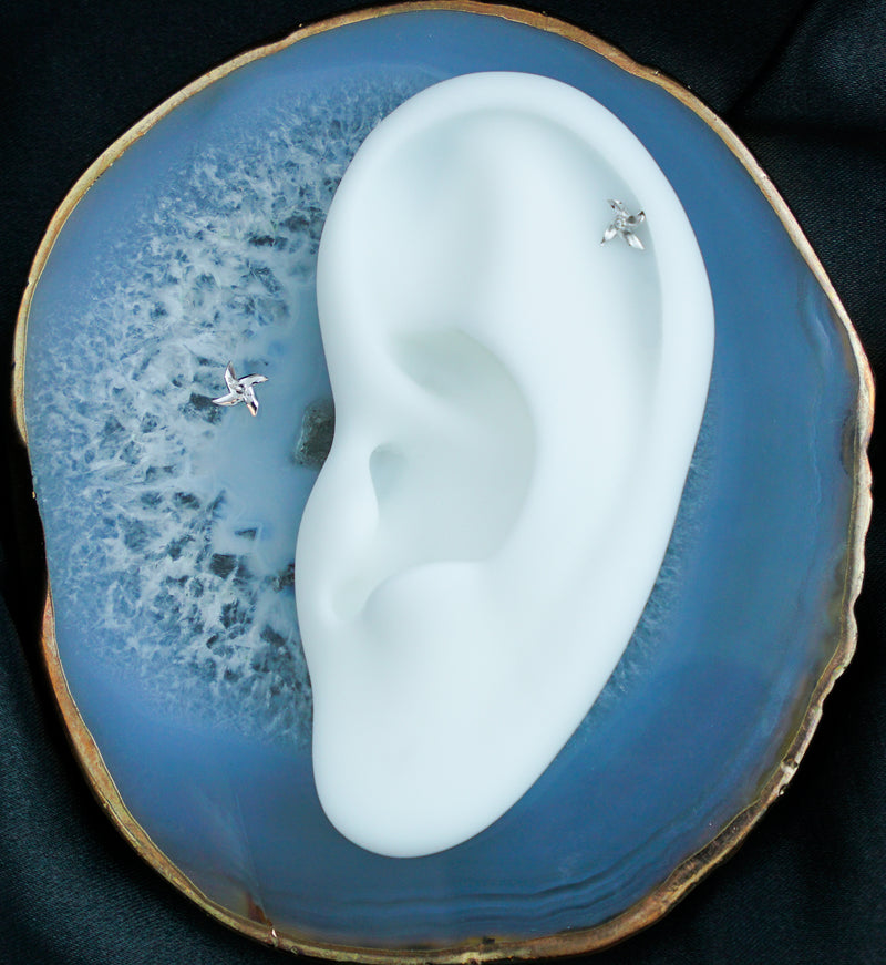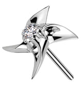 14kt nickel-free white gold pinwheel threadless top piece that is accented with a centered, clear cz gem. Pin size is 25G and fits most threadless posts. The size is about 5mm x 5mm. Cute top piece to add to your threadless top collection! Sold individually (top only).