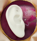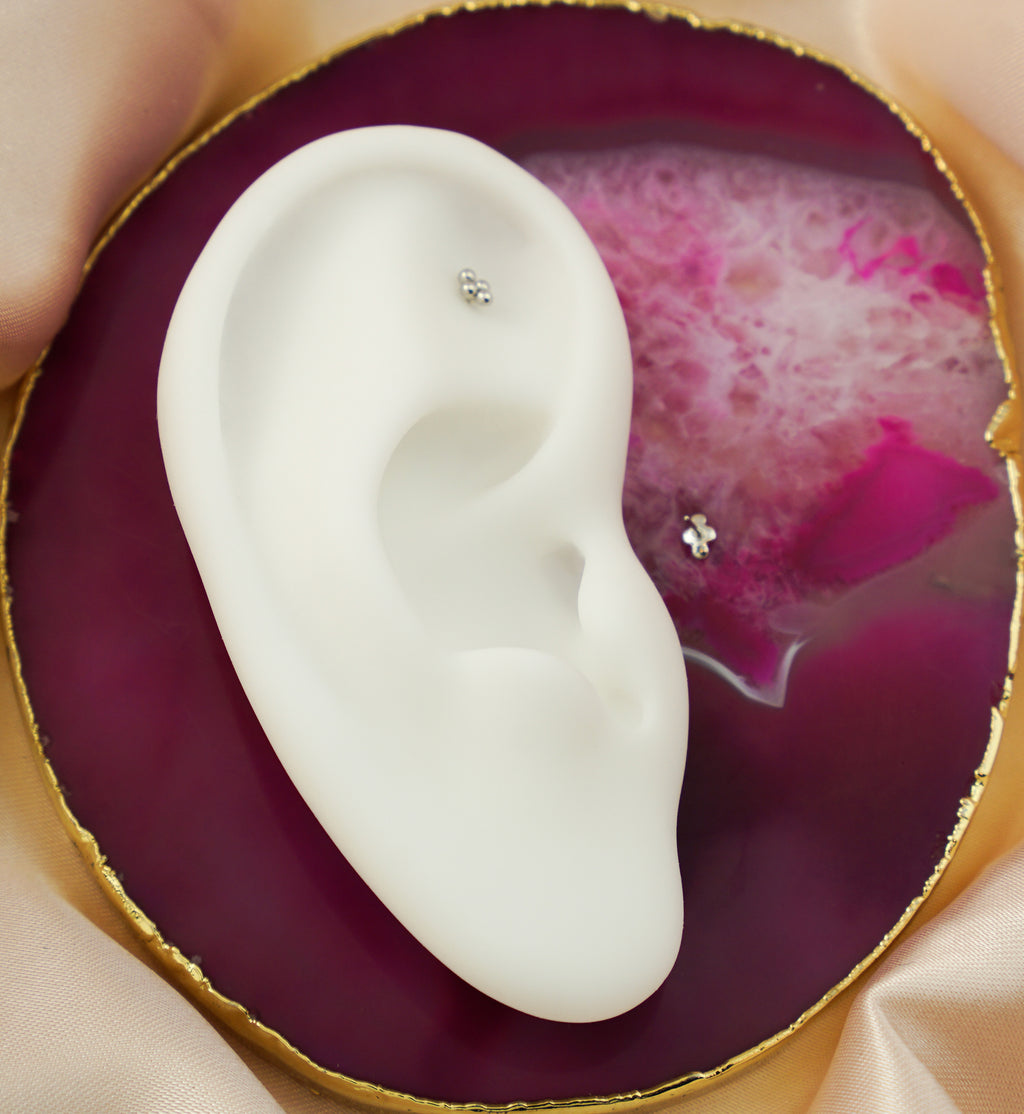 Threadless top piece that has a quad bead design. This jewelry piece is made with 14kt nickel-free white gold and a 316LVM ASTM F-138 5mm stainless steel pin. Dainty jewelry piece for a variety of ear piercings! Sold individually (1pc).
