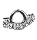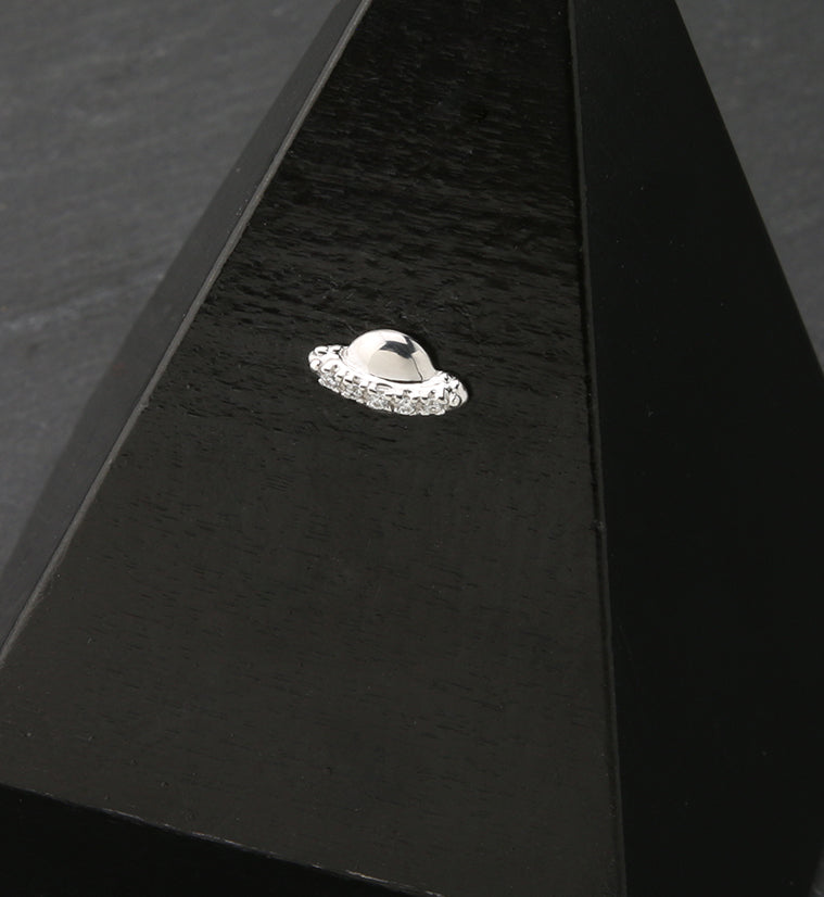 Threadless top piece that has a planet saturn shape with a ring of clear cz gems. Universal piece for your threadless collection! Fits all threadless posts. Made from 14kt nickel-free white gold. Length is approximately 6mm. Top size: 10mm x 5mm. Sold individually (1pc, top only).