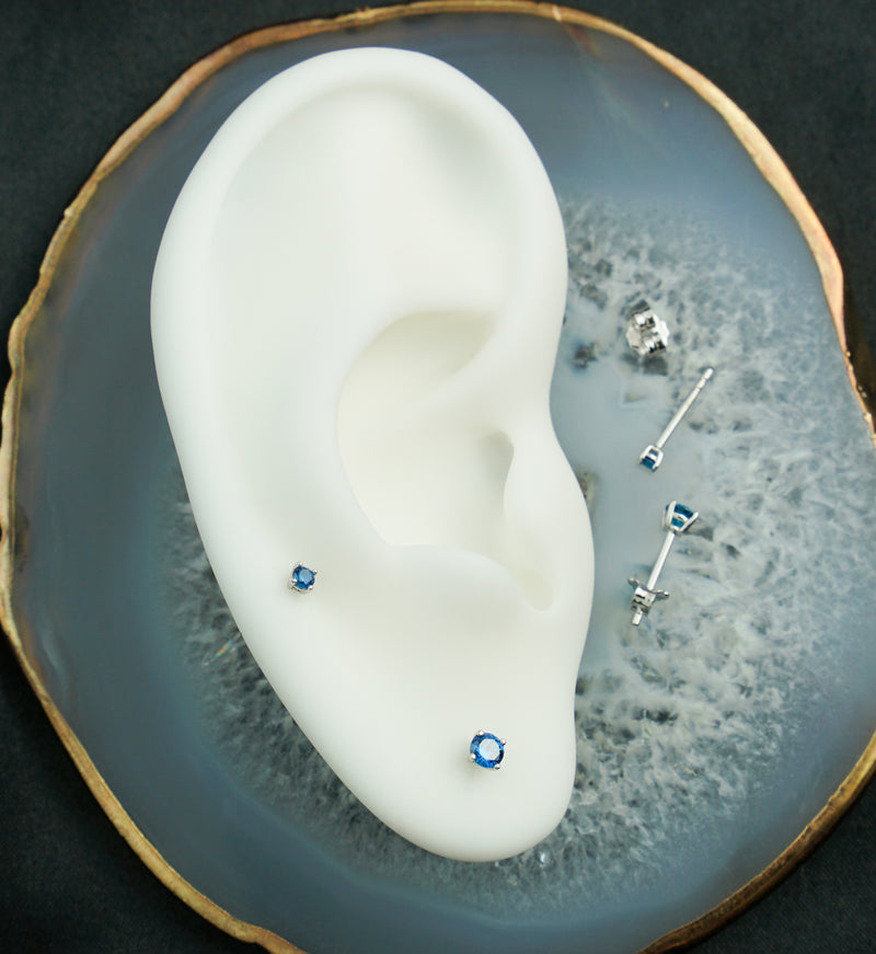 Birthstone stud earrings with a round, sapphire blue cz gem, the beautiful birthstone for September. Made from high-quality 14kt white gold. Size is 20G with a length of 1/4" (6mm). The stud earring design has a butterfly back. Choose your gem size : 2mm or 3mm! Sold in pairs (2pcs). For healed piercings - these might have small traces of nickel.