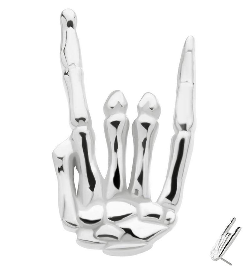 Threadless top jewelry piece that has a skeleton hand design in the shape of a "rock on" or "devil's horns" sign. Fits all threadless posts. Made from 14kt nickel-free white gold with a 316L stainless steel pin. Length is approximately 5mm. Top size: 9.9mm x 6mm. Sold individually (1pc, top only).